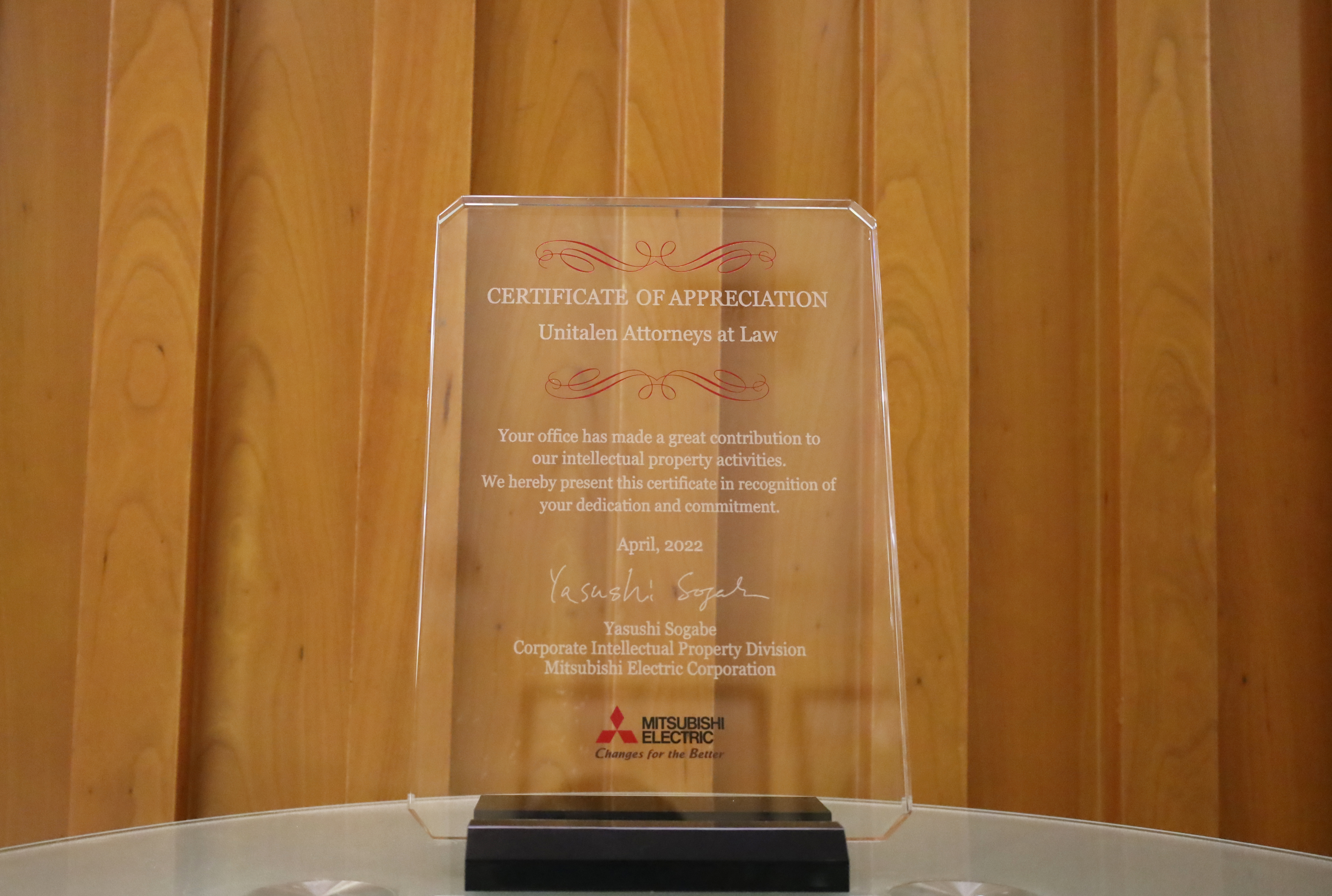 Unitalen was awarded by Mitsubishi Electric Corporation for "outstanding contribution to the practical proposal on the commodity catalogue notarization method as a countermeasure against counterfeit design applications ". Mitsubishi Electric Corporation selects one or two excellent cooperative firms worldwide for an award every year. Unitalen is the only Chinese firm to receive this award in this year, and it has been the second time for Unitalen to receive this honor since 2019.
