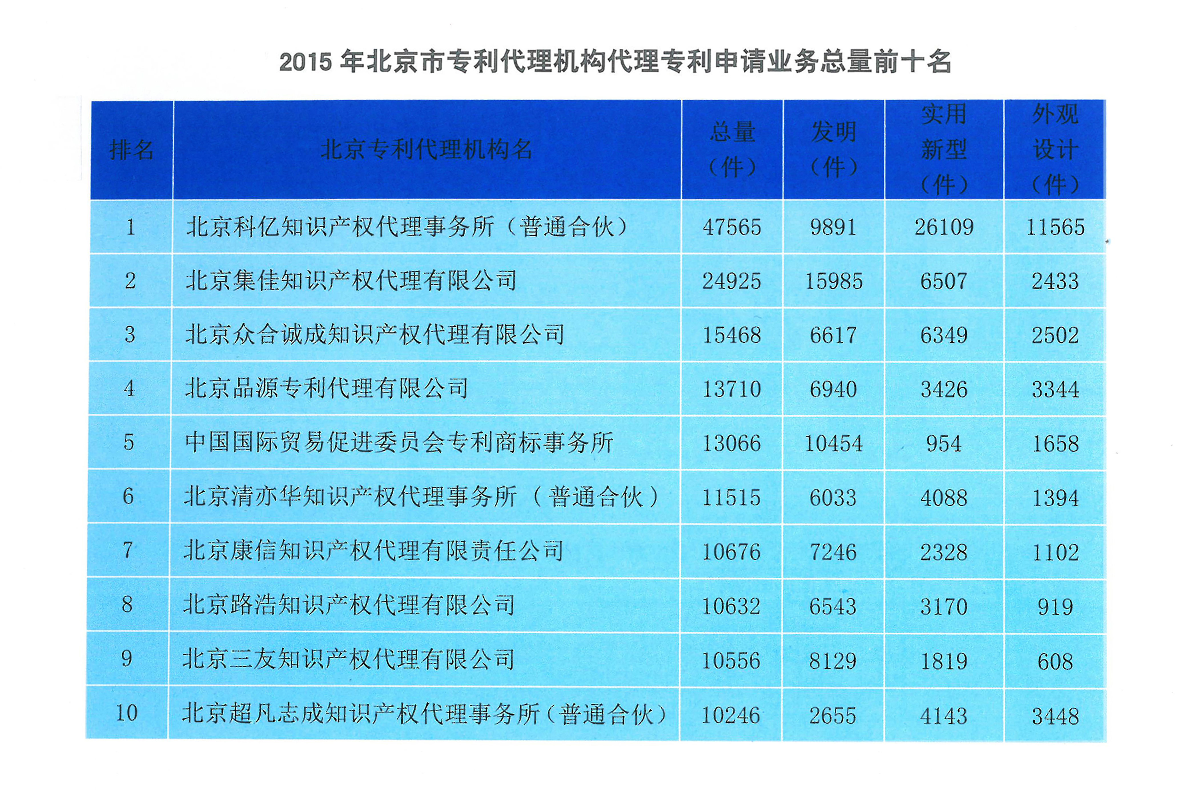 日前,北京市知識產權局發布了《2015年度北京市專利代理年報》,在北京專利代理機構業務排名中,集佳以代理量15985件的成績在發明專利申請量中再次排名第一,并在專利申請業務總量中排名第二。此外,經過專家評審,集佳憑借綜合的業務能力和優質的專業服務,連續三年入選“北京市優秀專利代理機構”。
