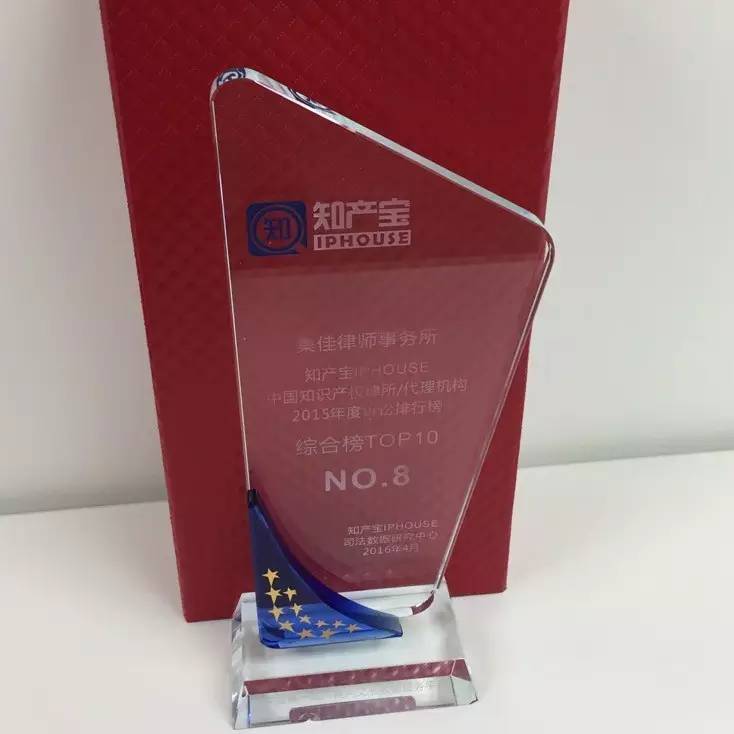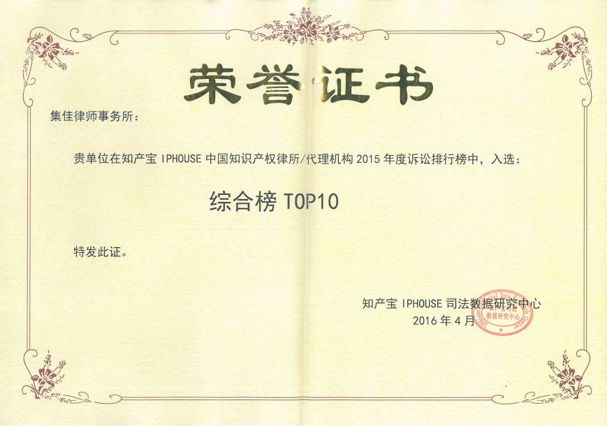 2016年5月11日下午, 知產寶司法數據研究座談會暨知產寶中國知識產權律所訴訟排行榜優秀律所頒獎儀式在京舉行,集佳律所憑借自身的專業實力和卓越的影響力入選行政榜TOP10和綜合榜TOP10。各級司法機關代表、相關國家駐華使館人員及優秀的律所、代理公司代表等五十余人參加了此次頒獎儀式。