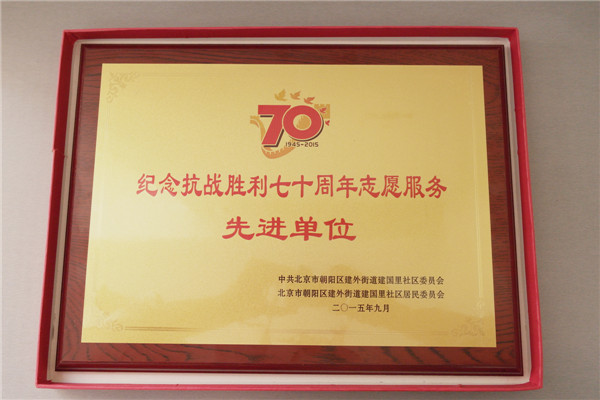 其中,我公司許燕妹、吳朝、李騰、王春菊4位志愿者在長安街執勤引導觀禮群眾的志愿服務活動中,認真負責、無私奉獻、成績顯著,體現出了志愿者嚴謹細致、奉獻求實、拼搏奮斗的優良作風。他們被中共北京市朝陽區建外街道建國里社區委員會和北京市朝陽區建外街道建國里社區居民委員會授予“紀念抗戰勝利七十周年志愿服務先進個人”證書。與此同時,集佳也被授予“紀念抗戰勝利七十周年志愿服務先進單位”稱號。