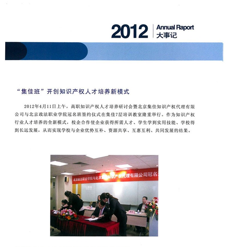在北京市知識(shí)產(chǎn)權(quán)局近期公布的《2012年度北京市專利代理年報(bào)》中,“‘集佳班’開創(chuàng)知識(shí)產(chǎn)權(quán)人才培養(yǎng)新模式”入選2012年行業(yè)大事記。