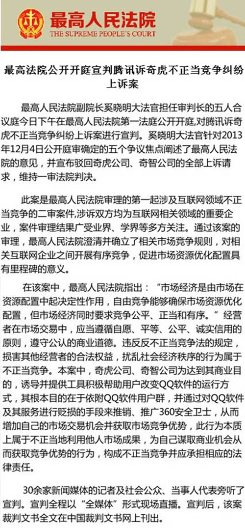 由北京市集佳律師事務(wù)所張亞洲律師、周丹丹律師代理的騰訊訴奇虎不正當(dāng)競爭一案二審,于2014年2月24日下午,由最高人民法院副院長奚曉明大法官擔(dān)任審判長的五人合議庭在第一法庭公開開庭宣判,宣布駁回奇虎公司、奇智公司的全部上訴請求,維持一審法院判決。