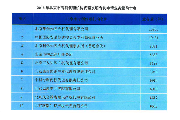 北京市知識產(chǎn)權局發(fā)布《2015年度北京市專利代理年報》,在北京專利代理機構業(yè)務排名中,集佳以代理量15985件的成績在發(fā)明專利申請量中再次排名第一,并在專利申請業(yè)務總量中排名第二。此外,經(jīng)過專家評審,集佳憑借綜合的業(yè)務能力和優(yōu)質的專業(yè)服務,連續(xù)三年入選“北京市優(yōu)秀專利代理機構”。