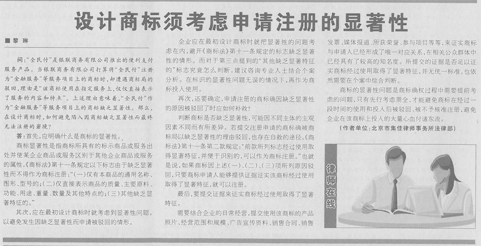 集佳代理人撰文《設(shè)計商標(biāo)須考慮申請注冊的顯著性》在《中國貿(mào)易報》發(fā)表