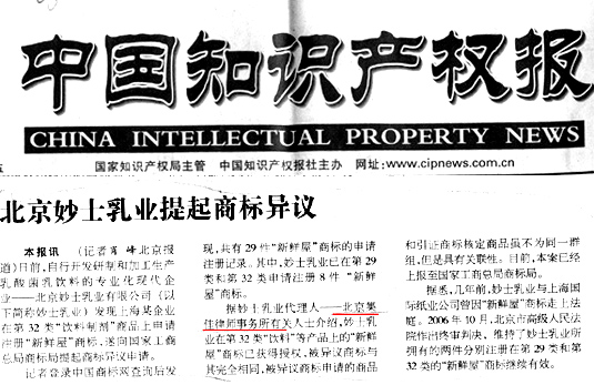 《中國知識產權報》北京妙士乳業提起商標異議