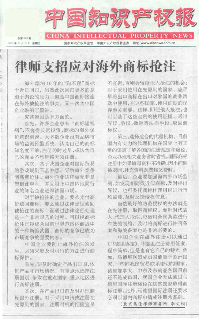 《中國知識產(chǎn)權(quán)報(bào)》:律師支招應(yīng)對海外商標(biāo)搶注