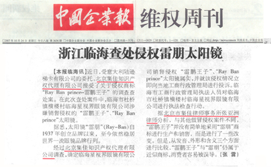 《中國企業(yè)報》:浙江臨海查處侵權(quán)雷朋太陽鏡