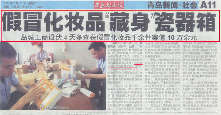 《半島都市報》、《中國知識產權報》:集佳聯合青島市李滄工商分局破獲大規模假冒化妝品案