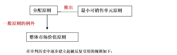 美國在相關的判例中確立了一套相應的規則。早在1953年,美國最高法院便在判決中提及,不考量專利是否涵蓋整個機器或是機器的改良而用相同規則來計算損害賠償,是個很嚴重的錯誤。至1984年的Garretson v. Clark案,這一做法進一步確立,即:在計算合理的許可費時,不應該以侵權產品的總價作為計算基礎,如果專利只占了產品或服務的一小部分,法院應該以專利所涉及的產品利益部分作為判決基礎,此之謂“分配原則”。