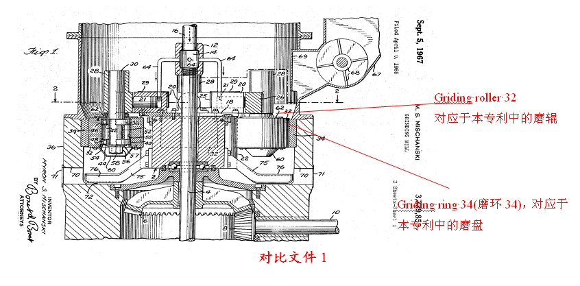 上述對比文件(雷蒙機)的附圖中,其磨輥和磨盤兩者磨面的外輪廓線與地面垂直,且二者的軸心線平行。因此,磨輥與磨盤的相對位置關系僅為簡單的內外關系(完全內側),也即是二者磨面的外輪廓線與軸心線均與地面垂直,并不存在上下關系。然而,在本專利的主要實施例中,磨輥與磨盤之間存在著上下關系,呈斜上方布置,參見下述該專利的附圖1: