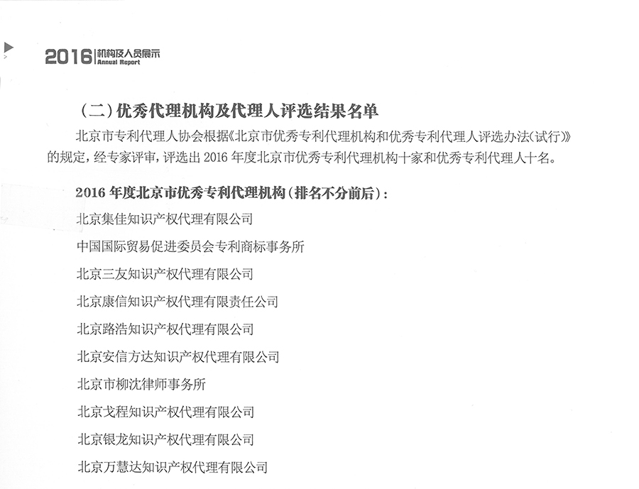 日前,北京市知識產(chǎn)權(quán)局發(fā)布《2016年度北京市專利代理年報》,在北京專利代理機構(gòu)業(yè)務(wù)排名中,集佳以代理量18841件的成績在發(fā)明專利申請量中再次蟬聯(lián)第一,并在多領(lǐng)域有效發(fā)明專利量排名中成績矚目。此外,經(jīng)過專家評審,集佳憑借綜合的業(yè)務(wù)能力和優(yōu)質(zhì)的專業(yè)服務(wù),連續(xù)四年入選“北京市優(yōu)秀專利代理機構(gòu)”,并在北京市專利代理人協(xié)會于2016年首次啟動的專利代理機構(gòu)等級評定工作中榮獲最高星級(AAAA)代理機構(gòu)。