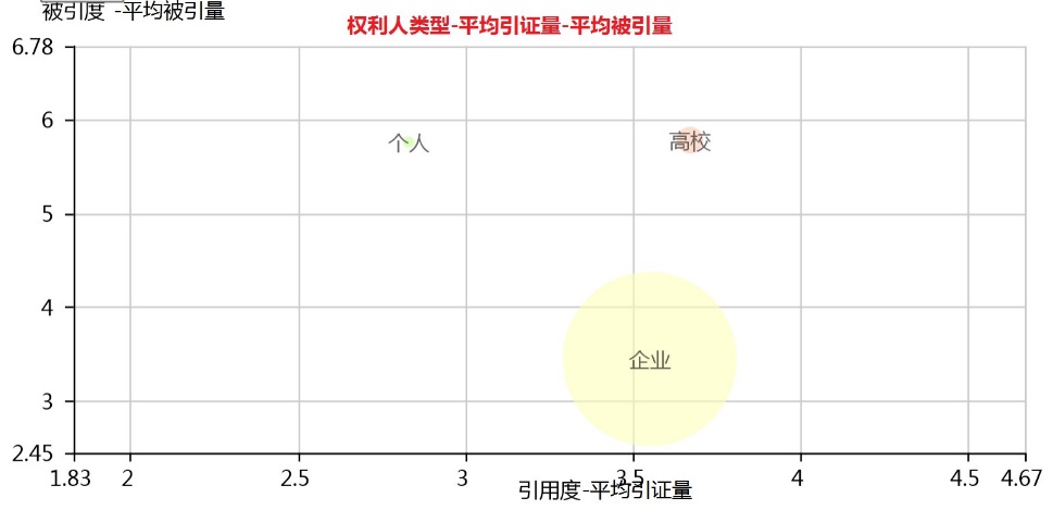 下圖為企業、高校、個人三種不同類型的權利人的專利質量氣泡。橫坐標為平均權利要求數量,縱坐標為平均技術特征數量,氣泡大小為獲獎專利數量。