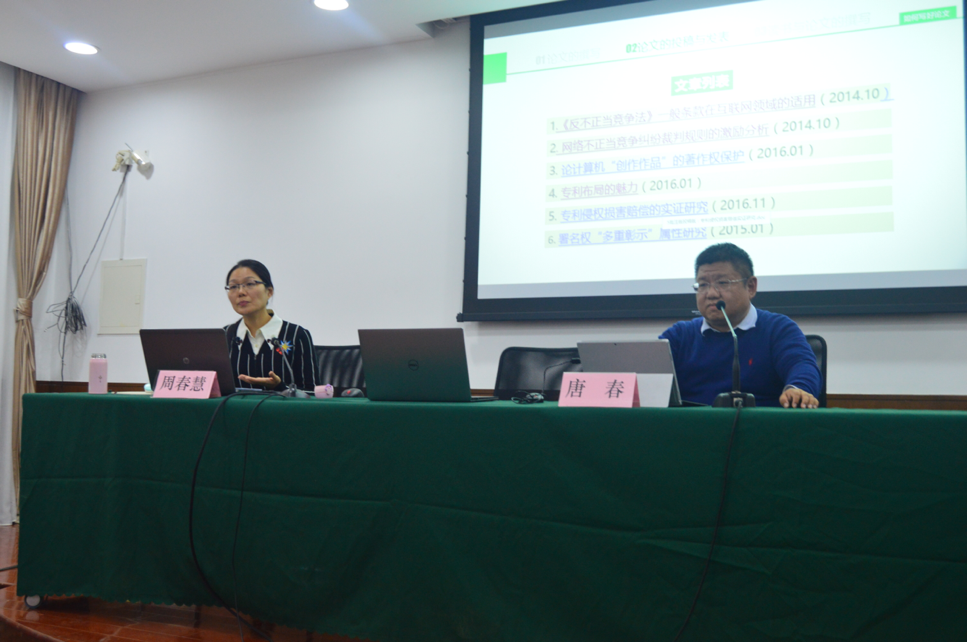 2017年11月12日上午9點半,第三屆“華政·集佳”杯綜述競賽系列學術活動之“知識產權論文寫作與投稿”專題講座在長寧校區交誼樓第三會議室進行。講座主講人為《電子知識產權》資深編輯周春慧老師,主持人為華東政法大學知識產權學院副院長唐春副教授。講座內容分為撰寫與投稿兩個部分。在論文撰寫方面,周老師就 “選題”、“文獻查閱、收集、閱讀”、“結構”、“撰寫”、“修改”、“成稿”六個方面進行了詳細的介紹,指出了在相關撰寫過程中應當避免的常見錯誤,講授了一篇好論文的具體撰寫方法。在投稿方面,周老師介紹了知識產權領域主要學術期刊的基本情況,以及各個期刊所偏好的論文題材,引導同學們有的放矢。在最后交流環節,周老師對同學們的問題進行了答疑解惑,與同學們進行了進一步的交流。