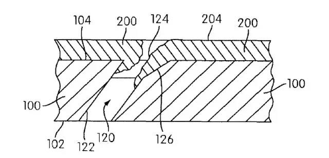 對比文件1教導(dǎo)的是一種再次敞開計量孔的方法,其用于舊構(gòu)件的翻新或再處理。也就是說,冷卻孔120的翼狀槽126(擴(kuò)寬部)在施加熱障涂層200之前就已經(jīng)存在于原有制品100中。這類似于本申請圖2中所示的現(xiàn)有技術(shù)。