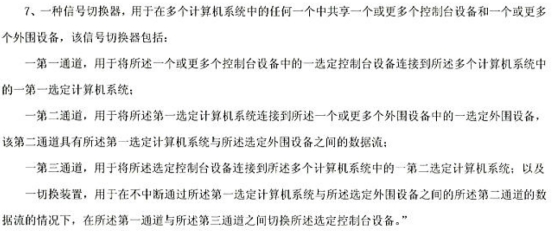 第二,從D1說明書公開的技術方案來看,D1文字公開了:通過操作控制鍵盤120上鍵入的熱鍵組合可以生成切換時間請求以選擇“用戶A”所有外圍設備,通過操作可控PS/2鍵盤190上的熱鍵組合可以選擇“用戶B”所有外圍設備114所要連接的計算機。由此可以確定:在對比文件1的方案中,當發出切換時間請求信號時,“用戶A”的所有外圍設備全部被切換至另一計算機,或者“用戶B”的所有外圍設備全部被切換至另一計算機。換言之,切換后,包含鼠標116等控制臺設備的外圍設備被一起從第一計算機切換至第二計算機,同時第一計算機與外圍設備的數據流必然中斷。