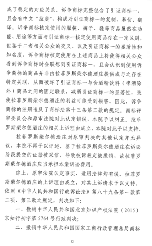 近日,北京市高級(jí)人民法院就 “卡斯特拉斐CASTEL LAFITE”商標(biāo)(由辛集市福泰皮業(yè)有限公司在2013年1與14日申請(qǐng)注冊(cè),核定商品為第25類服裝等)無效宣告一案,做出終審判決,認(rèn)定法國拉菲羅斯柴爾德酒莊在33類酒類商品上在先注冊(cè)的“LAFITE”商標(biāo),確為公眾所熟知,已構(gòu)成馳名商標(biāo);訴爭(zhēng)商標(biāo)“卡斯特拉斐CASTEL LAFITE”完整包含了在先馳名商標(biāo)“LAFITE”,且含有的中文“拉斐”是“LAFITE”常用的翻譯形式之一,因此訴爭(zhēng)商標(biāo)構(gòu)成了對(duì)引證馳名商標(biāo)的復(fù)制、模仿或翻譯,破壞了引證商標(biāo)與其標(biāo)示商品之間的固定聯(lián)系,減弱了“LAFITE”商標(biāo)的顯著性,使拉菲羅斯柴爾德酒莊的利益可能受損。據(jù)此,北京市高級(jí)人民法院判決撤銷一審判決及商評(píng)委裁定,并責(zé)令商評(píng)委重新作出裁定。