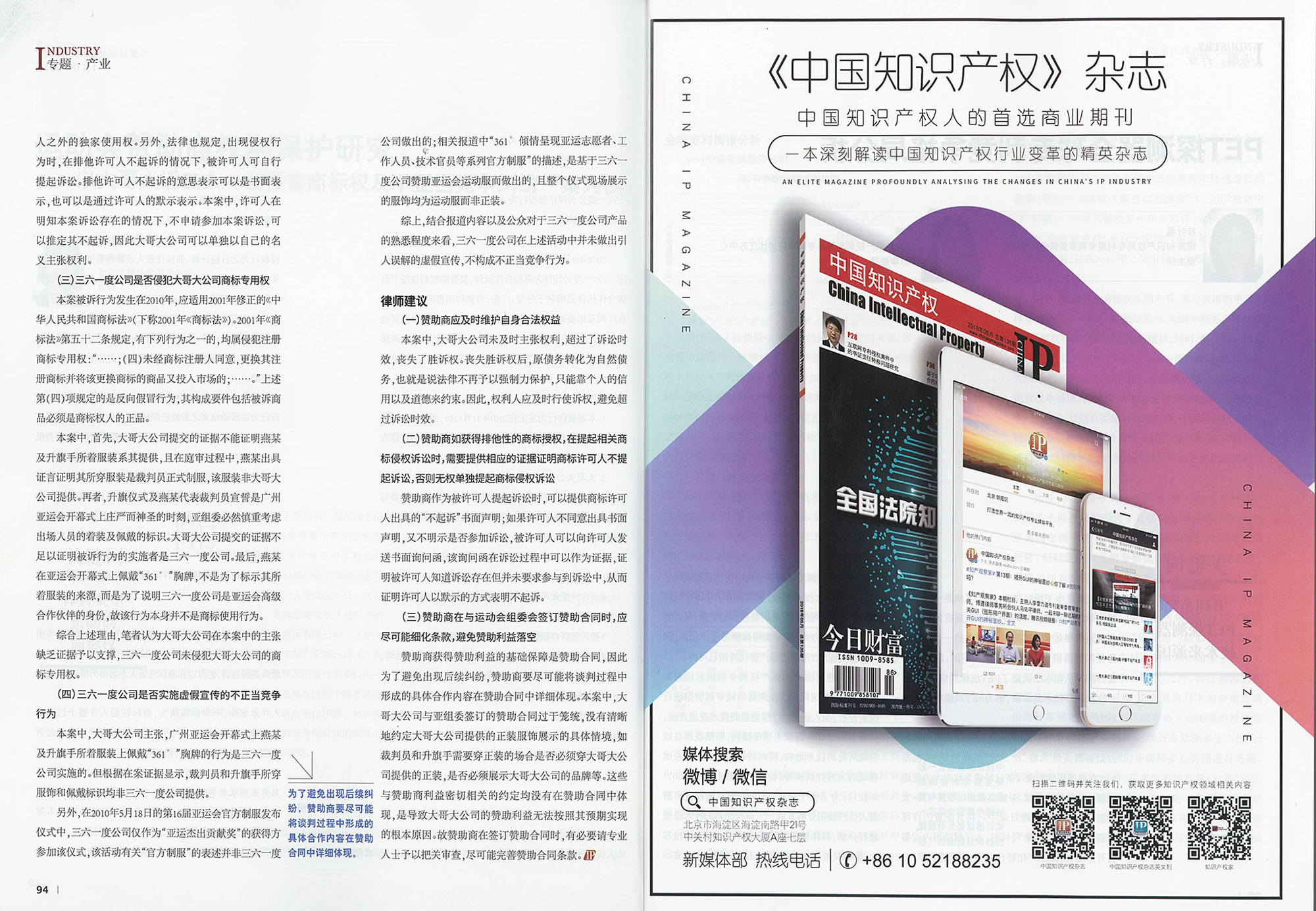 集佳文章《運動會贊助商權利保護研究——以大哥大訴三六一度侵害商標權及不正當競爭糾紛一案為例》在《中國知識產權》 發表