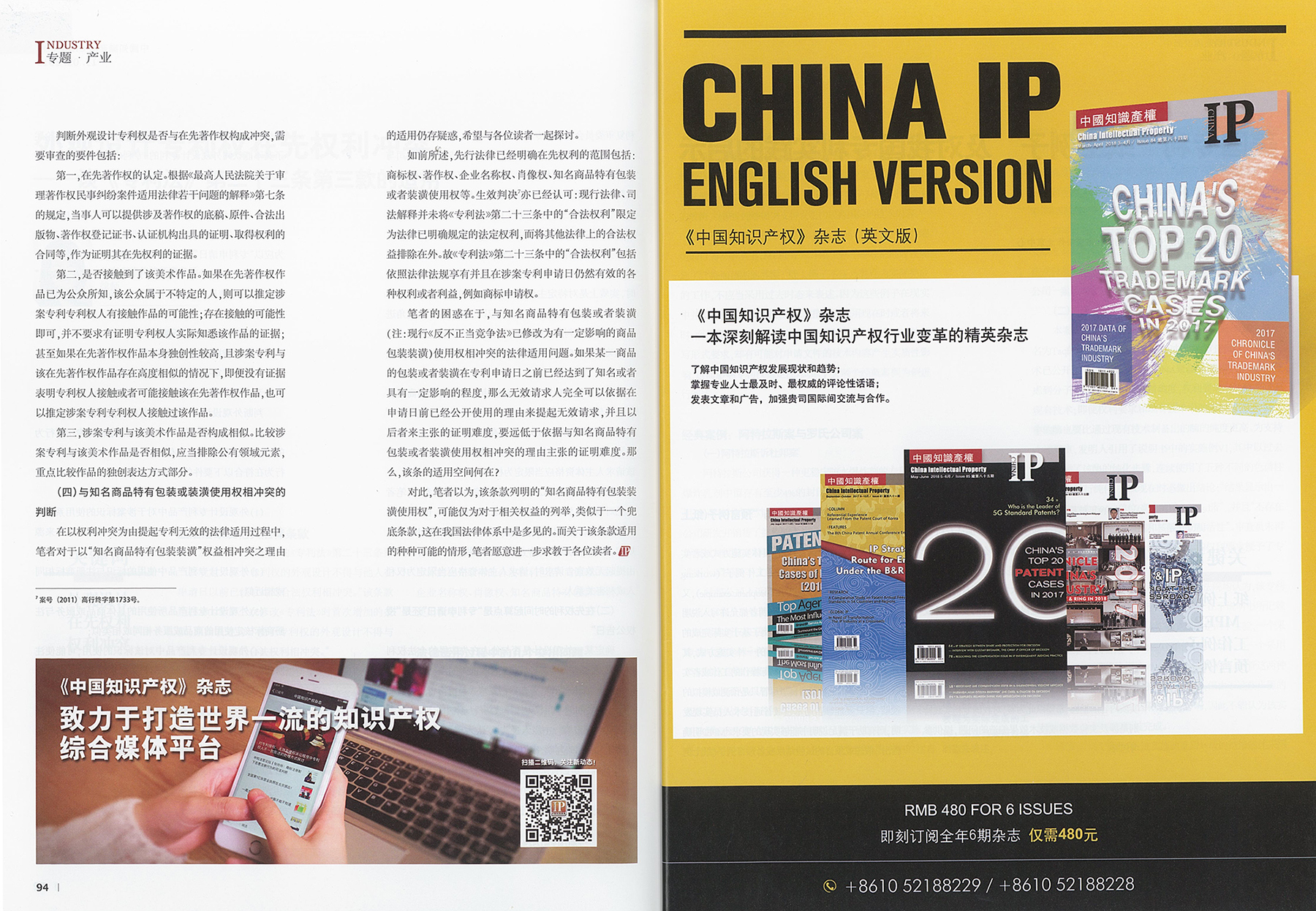 集佳文章《外觀設計專利權在先權利沖突——談<專利法>第二十三條第三款的適用》在《中國知識產權》 發表