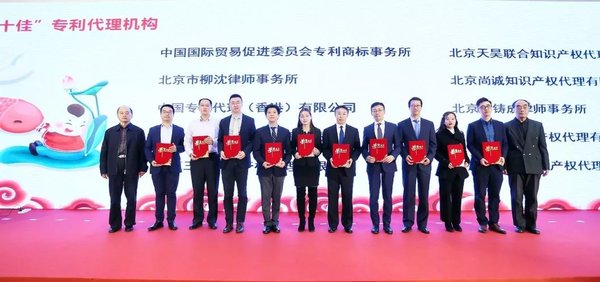 ▲集佳合伙人王艷江副所長(右六)領(lǐng)取“十佳專利代理機構(gòu)”榮譽證書