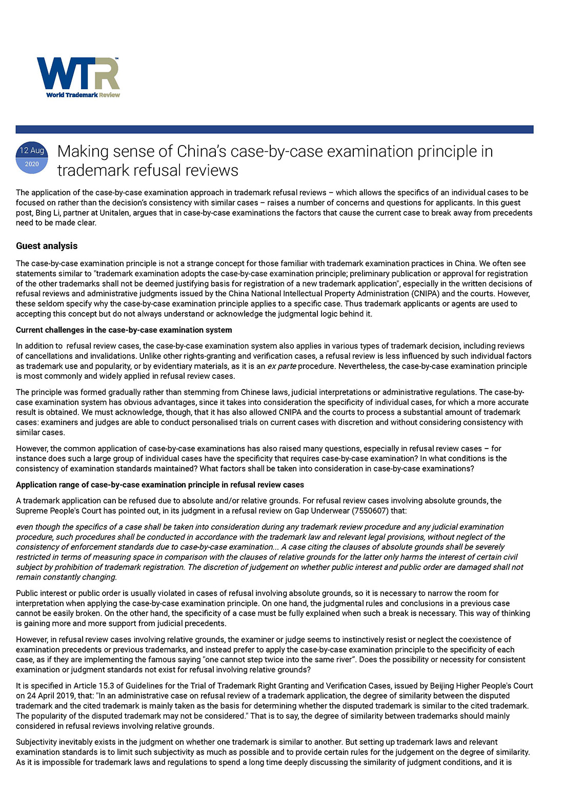 集佳文章《Making sense of China’s case-by-case examination principle in trademark refusal reviews》在《WTR》發表