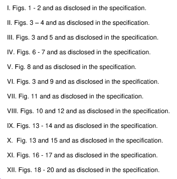 通過列出的權利要求與附圖的對應關系表格,即可以清楚地確定不同的子類對應的權利要求。例如,申請人選擇了 Species XII,其對應權利要求有1,2,3,5…。在這種情況下,建議選擇的同時一并進行反駁,從而在所選擇的權利要求授權之后,也可以重新加入其他未選擇的無沖突的權利要求。