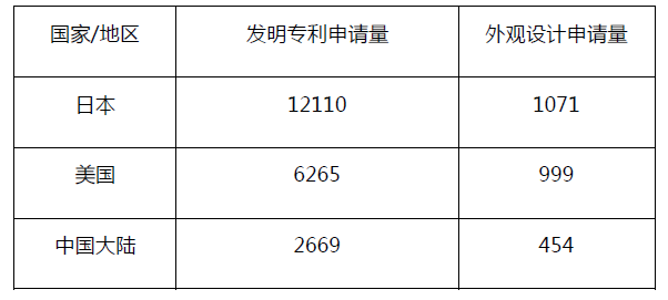2020年向中國(guó)臺(tái)灣地區(qū)申請(qǐng)的前三大國(guó)家和地區(qū)申請(qǐng)量,見下表: