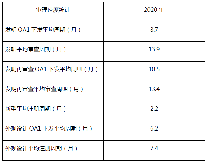 2020年中國(guó)臺(tái)灣智慧財(cái)產(chǎn)局審理速度統(tǒng)計(jì),見下表: