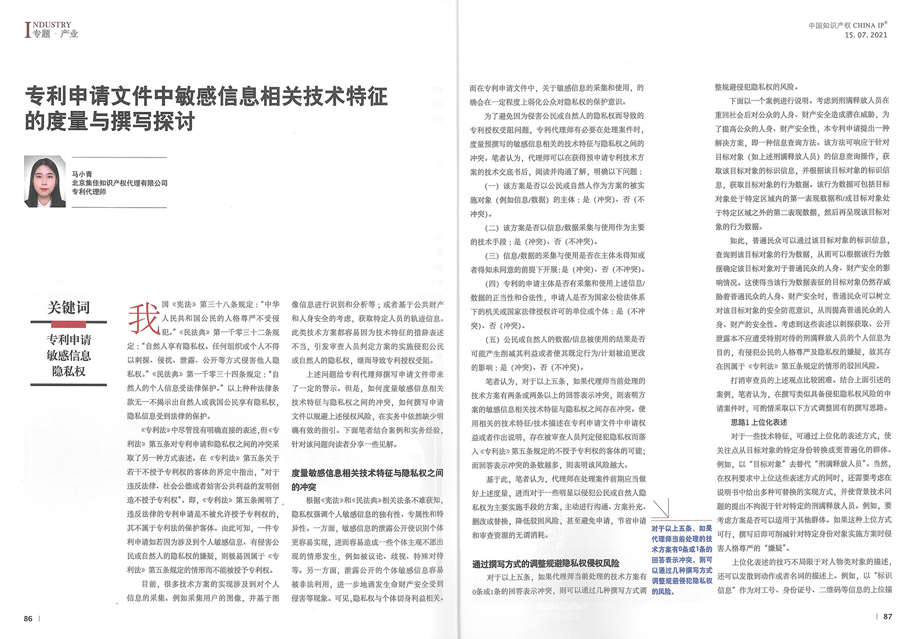集佳文章《專利申請文件中敏感信息相關技術特征的度量與撰寫探討》在《中國知識產權》發表