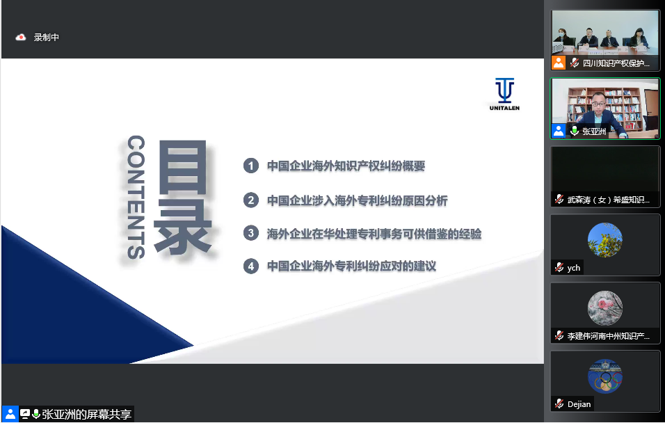 2022年4月20日,由中國(guó)(四川)知識(shí)產(chǎn)權(quán)保護(hù)中心、國(guó)家海外知識(shí)產(chǎn)權(quán)糾紛應(yīng)對(duì)指導(dǎo)中心四川分中心、四川省專(zhuān)利協(xié)會(huì)主辦,北京集佳知識(shí)產(chǎn)權(quán)代理有限公司協(xié)辦的“中國(guó)企業(yè)如何有效應(yīng)對(duì)海外專(zhuān)利糾紛”專(zhuān)題培訓(xùn)線上分享會(huì)成功舉辦。