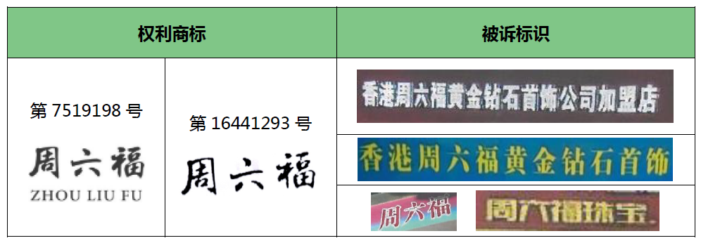 原審兩被告(中百珠寶首飾行和陳埭鎮周六福珠寶店)在其店鋪背景墻、店鋪招牌、首飾柜臺、首飾盒、廣告牌、包裝袋、首飾盒、質保單等多處使用上述被訴標識,其抗辯理由:一是此種使用方式系對特許人企業名稱的合理使用而非商標性使用行為;二是特許人享有在先使用權。一審判決認定突出使用“周六福”的“