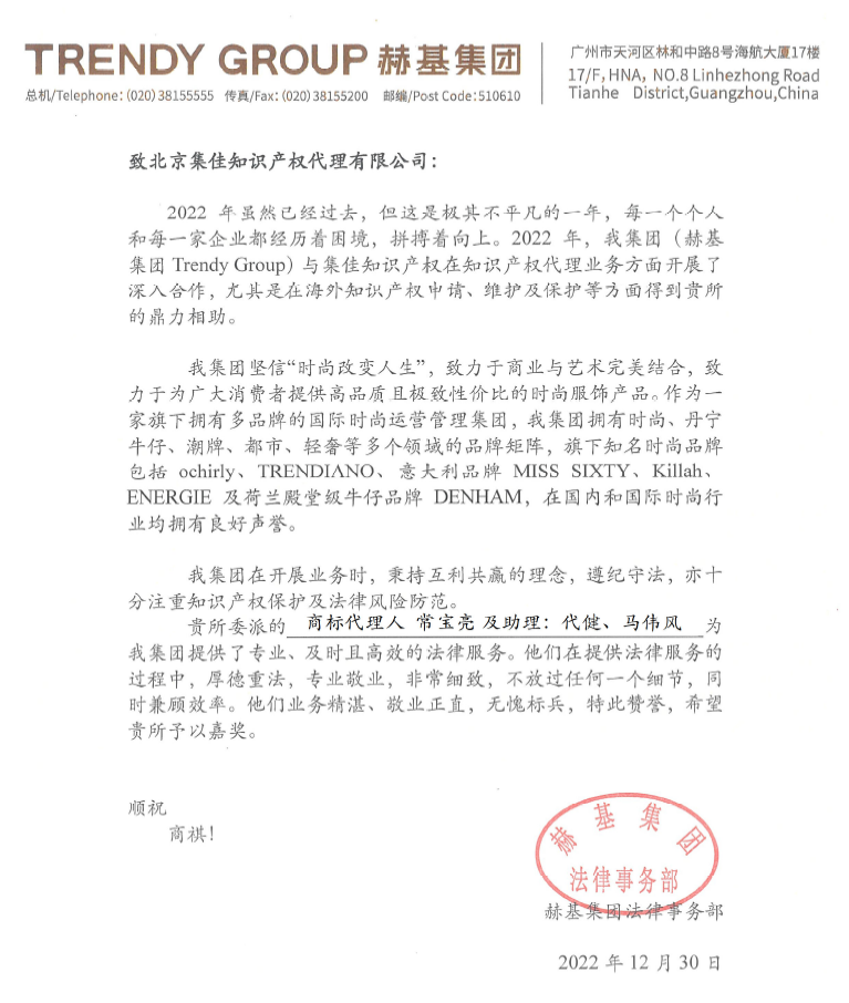 At the beginning of the new year, Unitalen received a warm commendation letter from the client Trendy Group. In the letter, Trendy Group highly recognized Unitalen's high-quality service and exquisite business in the fields of intellectual property protection and rights protection, advertising compliance, unfair competition, and highly praised the serious and responsible work attitude of Unitalen professionals such as ZHANG Yazhou, LI Yonghang, DONG Yiwen, CHANG Baoliang, DAI Jian, and MA Weifeng, speaking highly of them in the process of providing legal services for their morality and emphasis on law, professionalism and efficiency, dedication and integrity. They are worth of the role model!