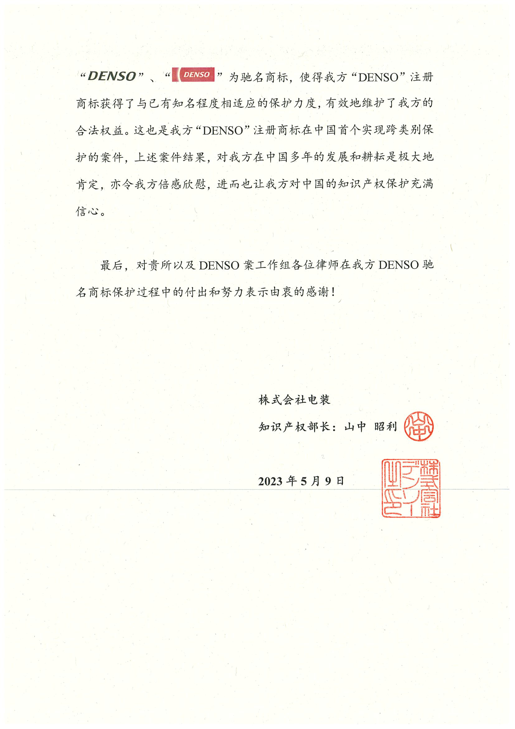 上述案件是“DENSO”注冊商標在中國首個實現跨類別保護的案件,通過該案,集佳成功代理客戶使其“DENSO”注冊商標獲得了與已有知名程度相適應的保護力度,有效地維護了客戶的合法權益。