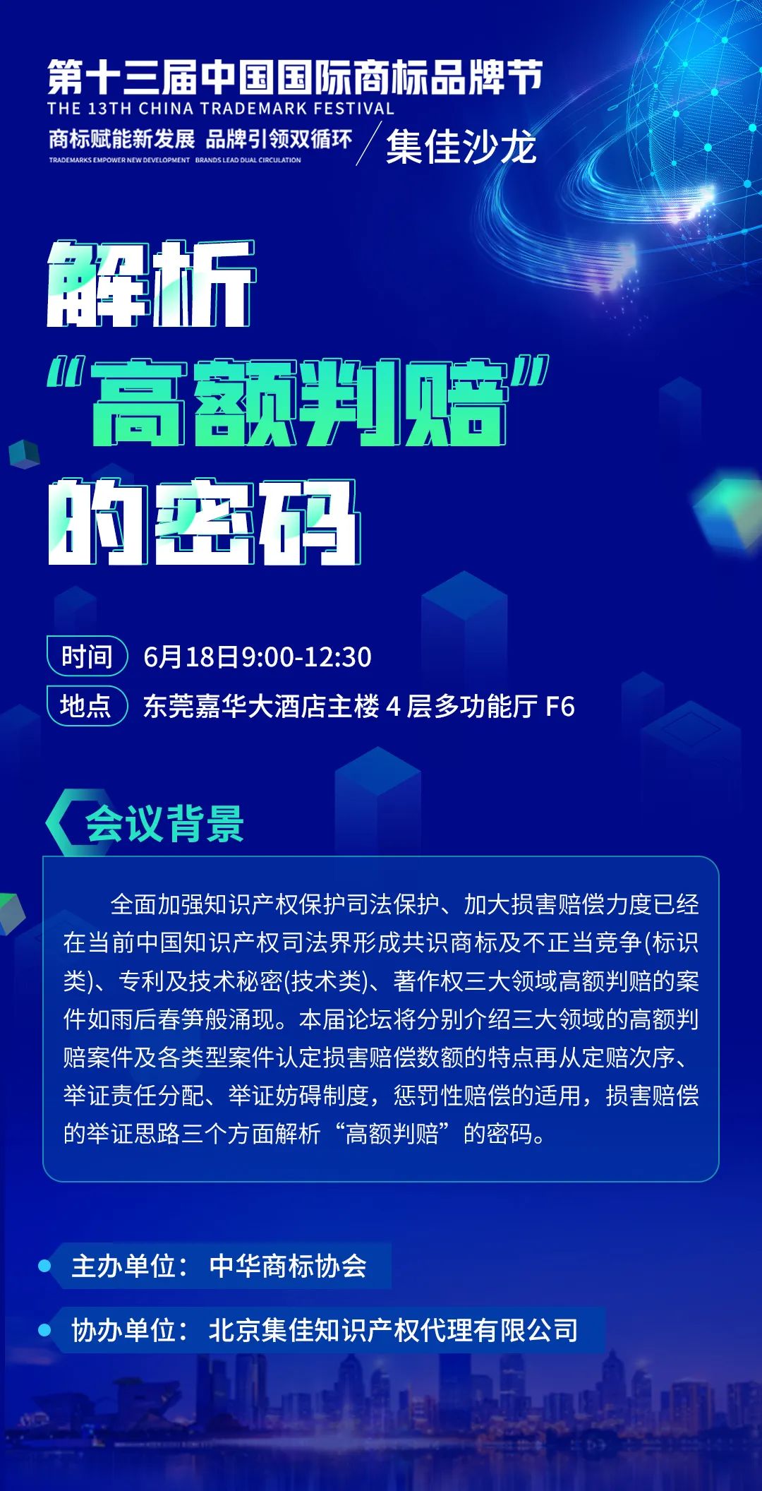 6月18日,集佳沙龍將在東莞嘉華大酒店主樓4層多功能廳F6舉辦,邀請(qǐng)資深法官、律師等眾多知名專家,共同解析知識(shí)產(chǎn)權(quán)案件“高額判賠”的密碼,屆時(shí)期待您的光臨!