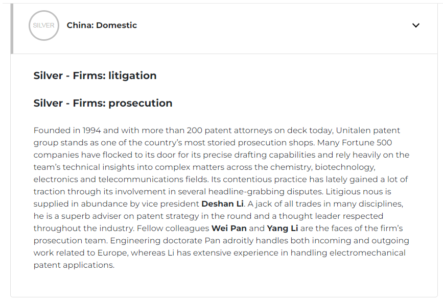 近期,國際權威知識產權媒體IAM(Intellectual Asset Management)公布了2023年度“IAM全球專利1000強”(IAM PATENT 1000)評選結果,集佳憑借在專利領域的杰出表現及客戶的廣泛認可,連續9年入選“專利確權”和“專利訴訟”兩大領域的年度推薦事務所名錄。同時,集佳合伙人李德山副所長獲評“專利訴訟”和“專利確權”兩大領域杰出個人,合伙人李洋副所長和潘煒博士榮登“專利確權”領域杰出個人推薦榜單。