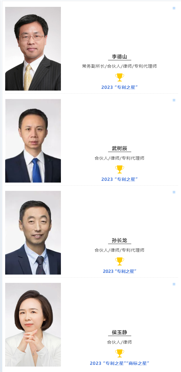 同時,李德山副所長、武樹辰律師、孫長龍律師和侯玉靜律師因其在各自領(lǐng)域的卓越實力和杰出表現(xiàn),分別獲評2023 IP Stars“專利之星”“商標(biāo)之星”美譽。