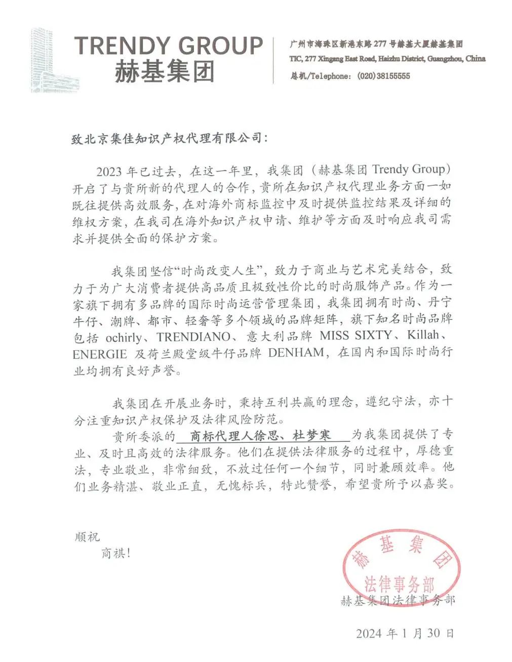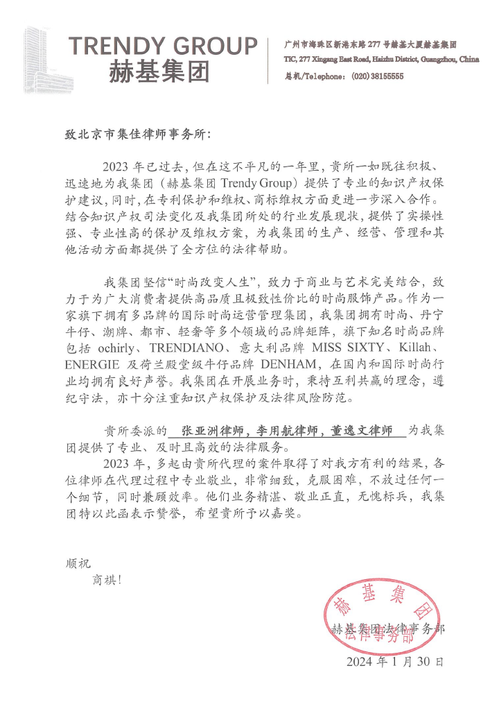 信中提到,2023年,集佳與赫基集團(tuán)在專利保護(hù)和維權(quán)、商標(biāo)維權(quán)方面更進(jìn)一步加強(qiáng)合作,集佳一如既往、迅速地為赫基集團(tuán)提供了專業(yè)的知識產(chǎn)權(quán)保護(hù)建議,集佳提供的實操性強(qiáng)、專業(yè)性高的保護(hù)及維權(quán)方案,為赫基集團(tuán)的生產(chǎn)、經(jīng)營、管理和其他活動方面都提供了全方位的法律幫助。赫基集團(tuán)法務(wù)部贊揚集佳張亞洲律師、李用航律師、董逸文律師、徐思律師、商標(biāo)代理人杜夢寒等,在提供專業(yè)、及時且高效的法律服務(wù)的過程中,厚德重法,業(yè)務(wù)精湛,敬業(yè)正直,無愧標(biāo)兵。