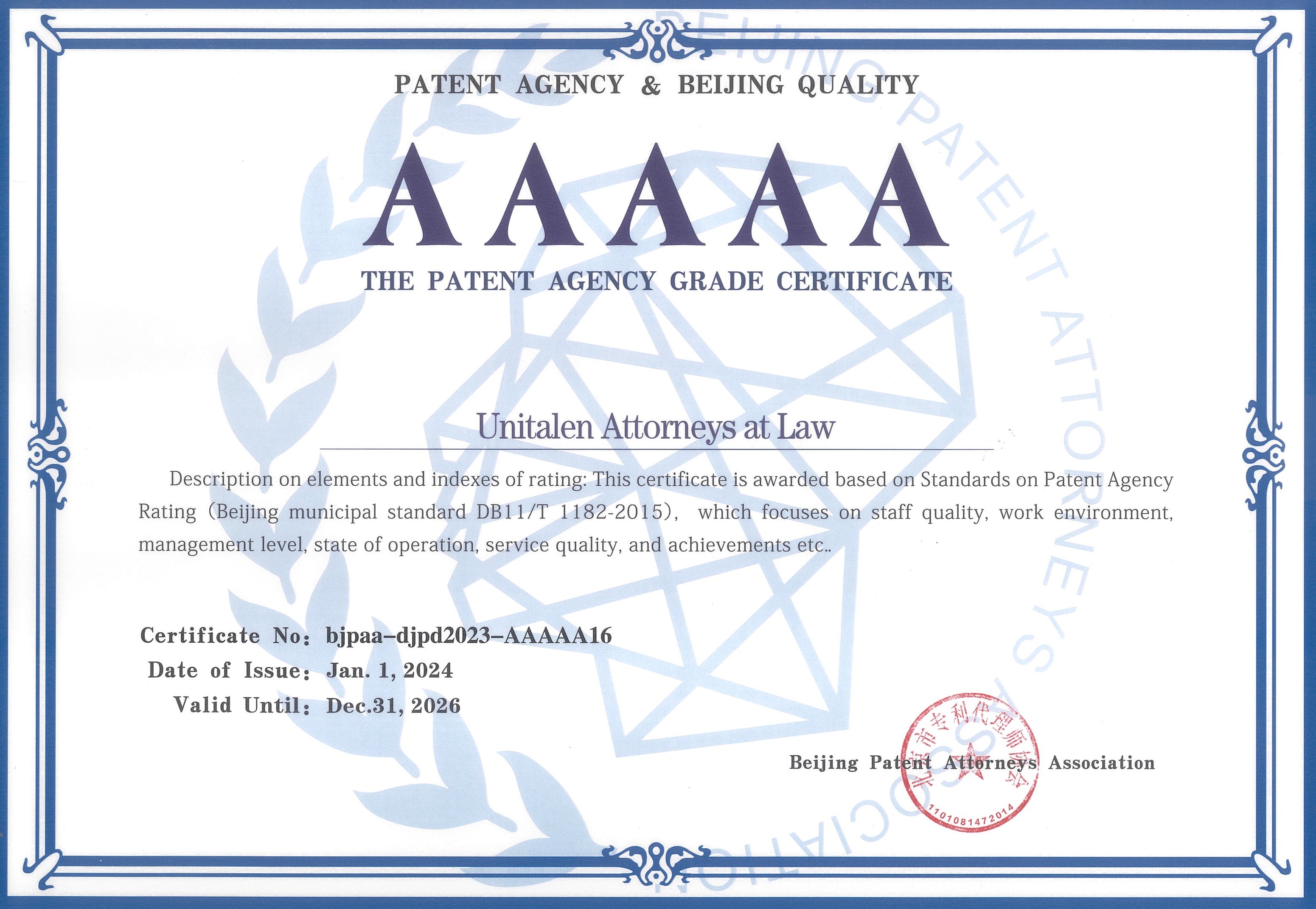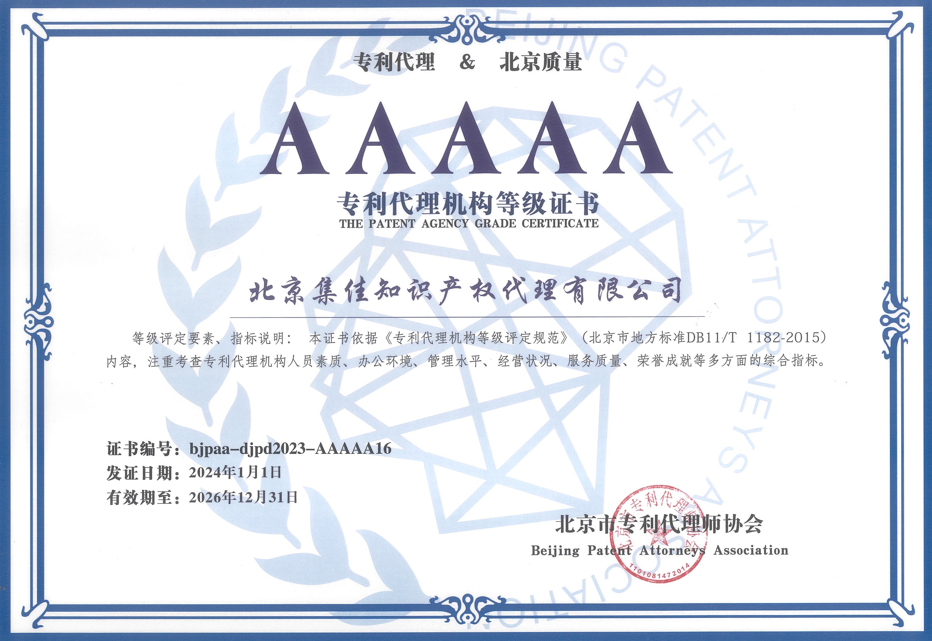 近日,北京市專利代理師協會發布2023年專利代理機構等級評定結果,北京集佳知識產權代理有限公司憑借穩健的綜合實力獲得各界肯定,再次獲評最高等級——AAAAA級專利代理機構。