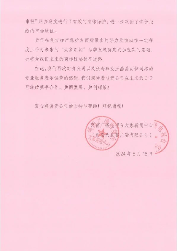 近日,我們收到河南廣播電視臺大象新聞中心(河南大象客戶端有限公司)的感謝信,對集佳在知識產權方面給予的專業支持與優質服務表示衷心感謝,并熱情稱贊集佳河南分公司張海燕與王晶晶在服務中展現出的“不拋棄、不放棄”的鉆研精神與專業細致的工作態度!