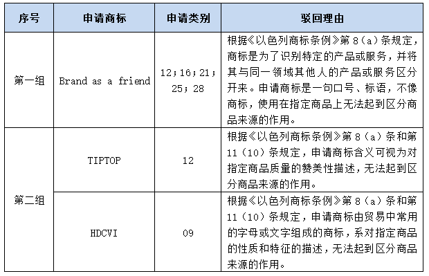 第一組商標(biāo)系因類似于標(biāo)語、口號而非商標(biāo)標(biāo)識而被認定缺乏顯著性并駁回。如上所示,商標(biāo)“Brand as a friend”含義為“以品牌為友”,相較于被消費者識別為商標(biāo)標(biāo)識,更容易被識別為一句口號、標(biāo)語,無法將其指定商品與同一領(lǐng)域其他人的產(chǎn)品或服務(wù)區(qū)分開來,故因缺顯被駁回。