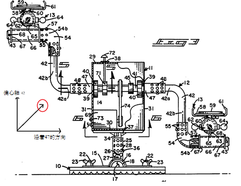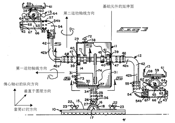 為此,代理人與審查員進(jìn)行了電話溝通,溝通后更加佐證了代理人的判斷。審查員認(rèn)為偏心軸42的縱向方向?qū)?yīng)于案例的權(quán)利要求5和6中的“第二運(yùn)動(dòng)軸線”。這完全不符合事實(shí)。根據(jù)對(duì)比文件3的圖3,顯然,如果將管式緊固套筒47認(rèn)為等同于案例中的第一運(yùn)動(dòng)軸線,那么垂直于圖層的方向(在附圖中的用紅圈標(biāo)明的方向)才等同于案例中的第二運(yùn)動(dòng)軸線。然而,可以明確地從對(duì)比文件3的圖3中看到,沿著偏心軸42的方向(在圖層的平面中豎直的方向)完全不同于案例中的“第二運(yùn)動(dòng)軸線”。此外,顯然偏心軸42根本不可能圍繞垂直于圖層的方向旋轉(zhuǎn)。對(duì)比文件3完全沒有公開權(quán)利要求5和6中的技術(shù)特征。