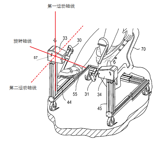 從對(duì)比文件4的圖5A中可見,審查員認(rèn)為對(duì)比文件4中的沿著豎直方向的軸線等同于案例的權(quán)利要求1中的“第一運(yùn)動(dòng)軸線”,踏板55圍繞其轉(zhuǎn)動(dòng)的轉(zhuǎn)動(dòng)軸線等同于案例的權(quán)利要求1中的旋轉(zhuǎn)軸線,因此,通過銷57限定的軸線(以紅色虛線在圖5A中示出)等同于案例的權(quán)利要求1中的第二運(yùn)動(dòng)軸線。