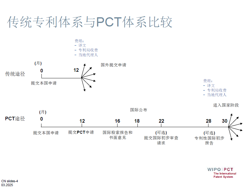 本國(guó)專(zhuān)利申請(qǐng)后12個(gè)月內(nèi)根據(jù)PCT提交國(guó)際申請(qǐng),要求《巴黎公約》優(yōu)先權(quán),“國(guó)家階段”在30個(gè)月時(shí)開(kāi)始。