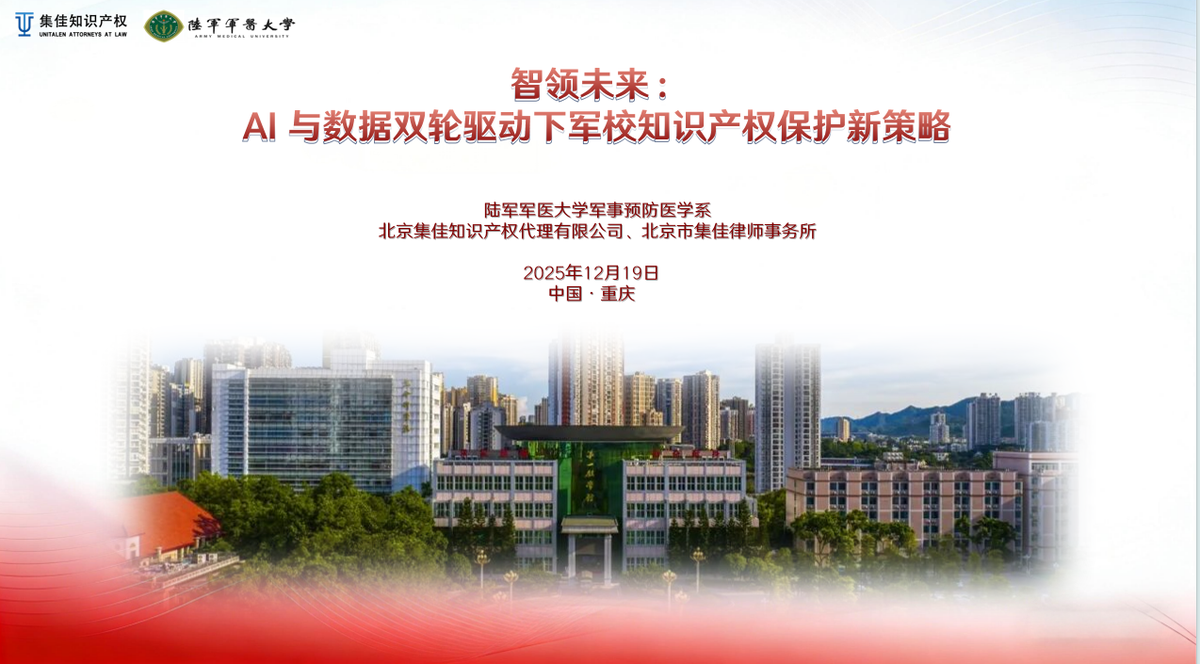 為響應國家知識產權強國建設戰略,助力國防科技領域科研成果的合規保護與高效轉化,2025年12月19日下午,北京集佳知識產權代理有限公司、北京市集佳律師事務所聯合陸軍軍醫大學軍事預防醫學系,成功舉辦"智領未來:AI與數據雙輪驅動下軍校知識產權保護新策略"專題講座。本次活動聚焦軍事醫學領域知識產權保護痛點難點,為該校系領導、各單位主任、分管科研副主任及科研骨干等帶來了一場高規格、實用性強的學術盛宴,獲得參會人員一致好評。