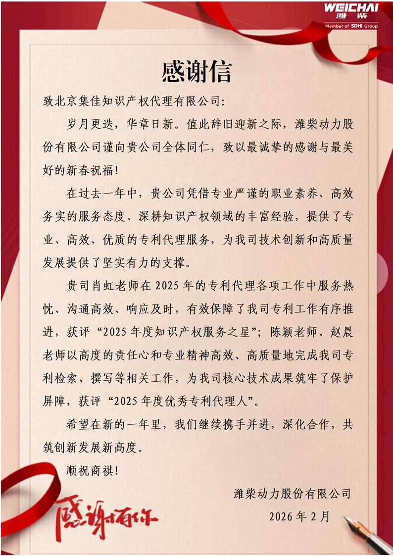 感謝信中提到,在過去一年中,集佳憑借專業嚴謹的職業素養、高效務實的服務態度、深耕知識產權領域的豐富經驗,為濰柴提供了專業、高效、優質的專利代理服務,為客戶的技術創新和高質量發展提供了堅實有力的支撐。濰柴特別贊譽集佳相關工作人員的高度責任心和專業精神,并授予集佳合伙人、知識產權顧問肖虹“2025年度知識產權服務之星”稱號,授予集佳專利代理師陳穎、趙晨“2025年度優秀專利代理人”榮譽稱號!